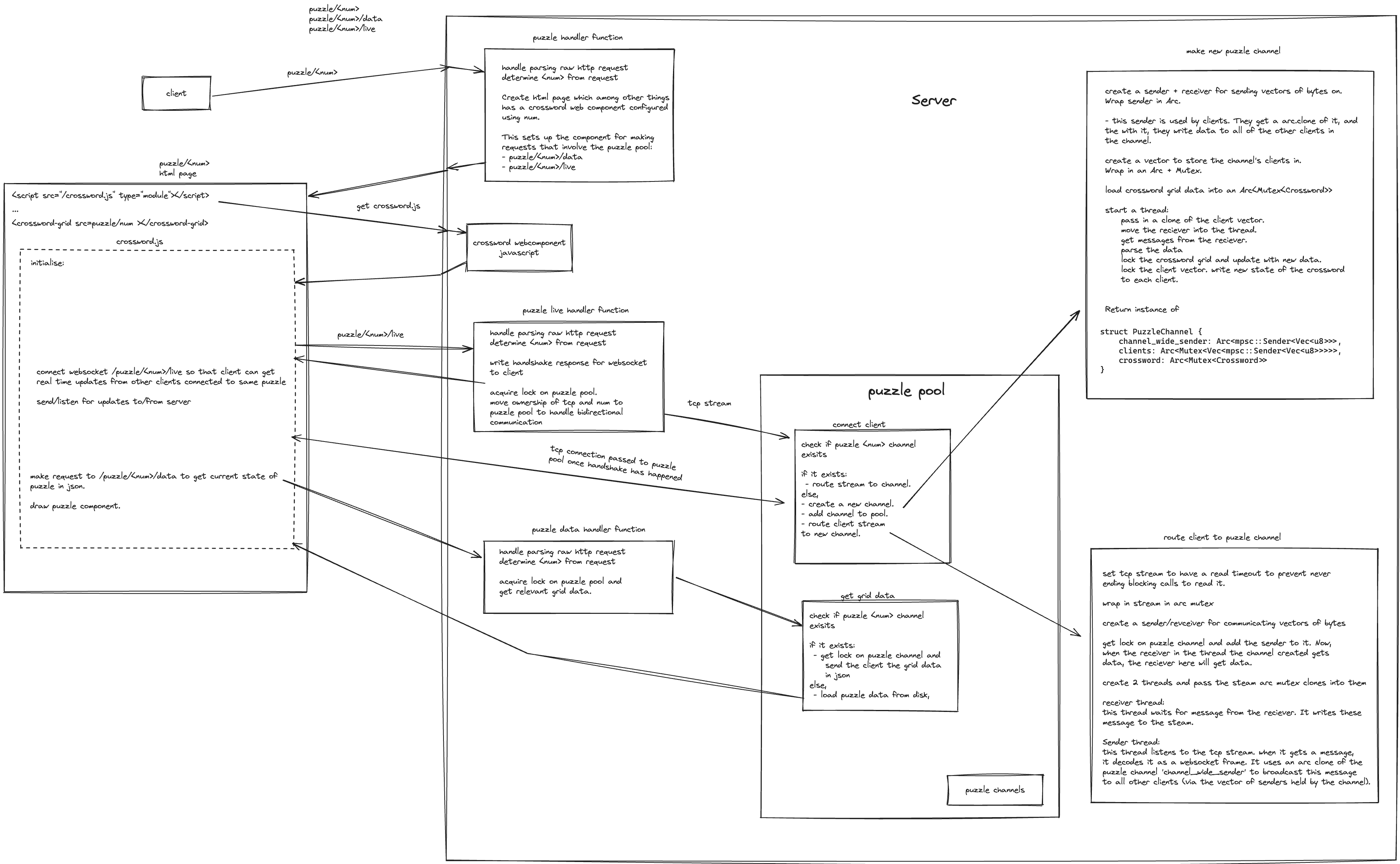 The source of truth for the puzzle is located on the server. An overview of the interactions between the client and the server is shown in the diagram below. If the puzzle is not being solved, it is stored on disk. If someone has established a WebSocket connection with the server for that puzzle, then that puzzle will be loaded into memory. Whenever the user updates one of the letters in the grid, they are sending a small message to the server over the WebSocket. The server receives this data, and it acquires a mutex on the crossword data structure, updates it, and broadcasts the change to all the connected clients. When the server detects that there are no more clients attached to the puzzle, the puzzle is serialised, and the on-disk puzzle is updated.